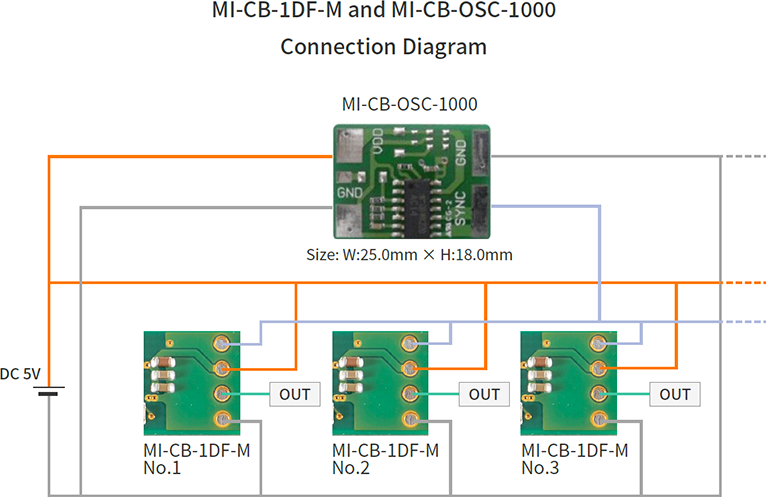 シングルタイプのナノテスラセンサMI-CB-1DF-Sを複数個並べて使用するとそれぞれのセンサが干渉して誤動作してしまいます。そこで、複数個を一緒に使用する場合は発振器を搭載していないタイプのMI-CB-1DF-Mを選択し、複数個に対して共通の発振器MI-CB-1DF-OSCを接続してください。マルチタイプMI-CB-1DF-Mをご購入の際は発振器が必要になりますので準備ください。(当社でも販売しております)